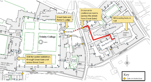 The Check-in for people accommodated at Trinity College will be at the Great Gate and Porter’s Lodge. Registration for the conference will be in the Blue Boar Common Room which is next to the Winstanley Lecture Theatre. All talks will take place in Winstanley Lecture Theatre, whilst the poster exhibitions will be in the atrium of the Winstanley Theatre (for NeuMat team) and in the Old Combination Room (OCR). Tea/Coffee breaks will be served in the Blue Boar Common Room. Reception drinks will be served in the Allhusen Room (next to OCR). Dinner and breakfast will take place in the Hall. Please see map below.